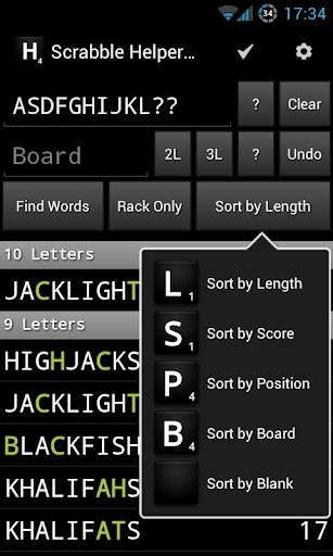 Resultate sortieren nach Länge, Ergebnis, Board / Blank Brief oder Letter Position in der um die besten spielbare Wort zu finden. Vorstand und Blank Briefe werden in Ergebnisse und Vorschau-Bildschirm für eine einfache Referenz markiert.
