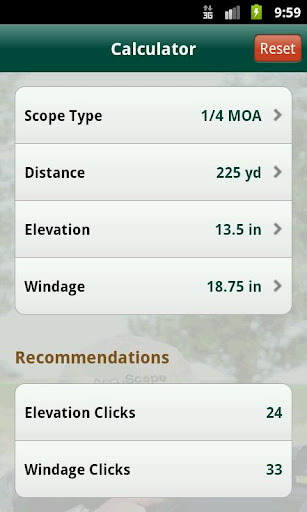 Given your scope’s MOA or Calibration number, your Shooting Distance, and pre-gathered Elevation (up/down) and Windage (left/right) off-center distances, AccuScope will "automatically" calculate the number of adjustment dial "clicks" needed to accurately sight in your scope.