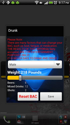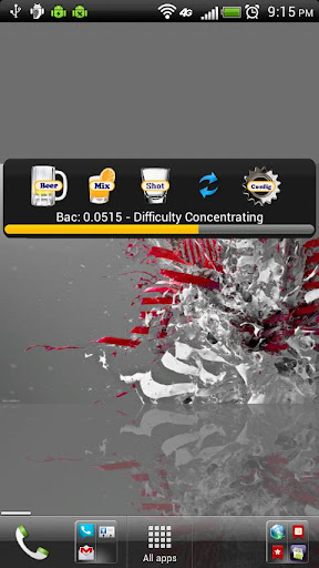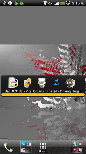 Are you drunk? This widget keeps track of the alcohol you drink and tells you your Blood Alcohol Content(Same number a breathalyzer gives you).