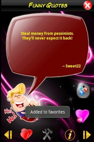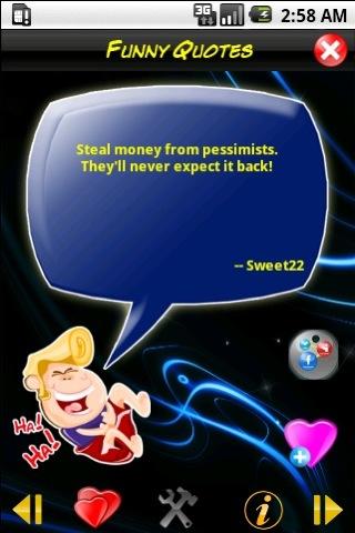 If jokes are your daily need then Funny Quotes is the Android application for you. A collection of funny one liners by famous people, it will crack you up. Available in a Pro(full list) and Lite(Smaller) versions, you can read, enjoy, bookmark and even share over Twitter and Facebook. So spread the cheer with Funny Quotes n