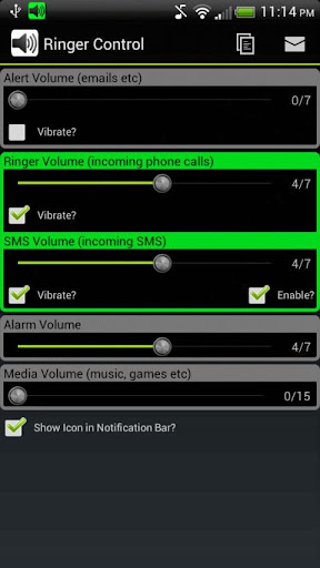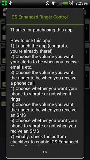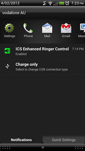 *** GO SMS PRO users, for ICS Enhanced Ringer Control to work for SMS you must do this -> In Go SMS Pro, go to Settings > Advanced > Receive Settings ... and uncheck "Disable other message notification". Then go into the stock SMS app, and disable notifications manually from in there. It "might" already be disabled, but its worthwhile making sure.