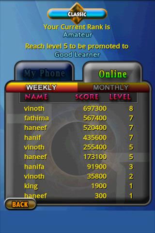 Online Scores! Scores of top ten players from all over the world are listed in weekly and Monthly tabs of our online score screen. At any time, you can compete with top ten weekly and monthly scorers and submit your scores after every game.