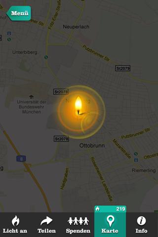 Einfach die „Licht an!“-App herunterladen - und schon brennt auf dem Handy die digitale Kerze und ein weiteres Licht strahlt auf der integrierten Deutschlandkarte.