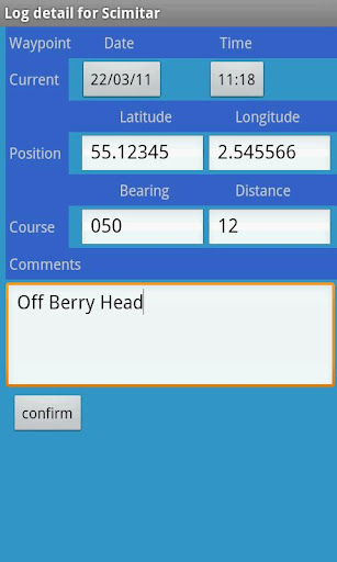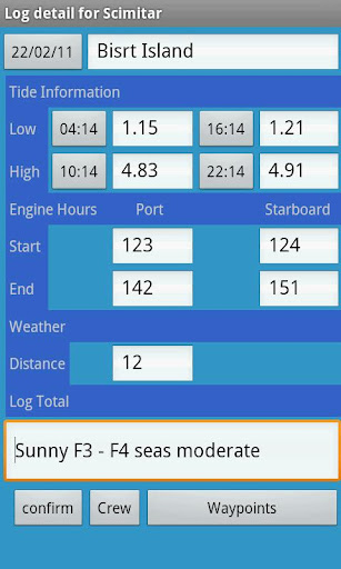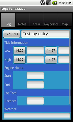 Keep track of any trips that you make including crew lists, tides, weather, waypoints, engine hours. Log individual waypoints by using the phone's built in GPS, record distances, course and speed. Track the waypoints on Google Maps.