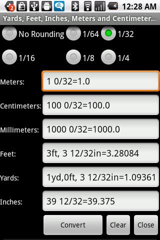 Yards, Feet, Inches, Meters, Centimeters, Milimeters. Rounding result to 1/64, 1/32, 1/16, 1/8 and 1/4th fraction supported.