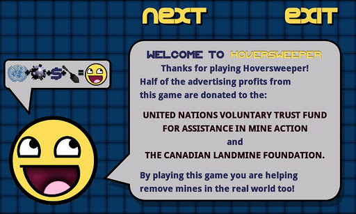 Die Hälfte der Gewinne aus Hoversweeper sind bei den Vereinten Nationen Freiwilligen Treuhandfonds zur Unterstützung bei der Mine Action & der kanadischen Landmine Foundation gespendet. Nicht viele Spiele können Sie tatsächlich etwas erreichen in der realen Welt!