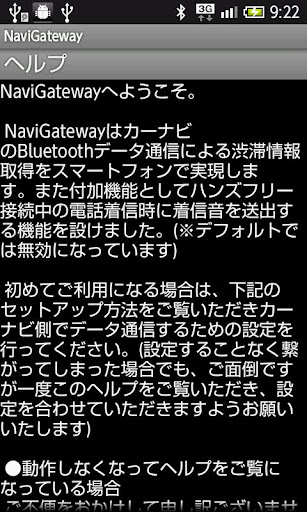 NaviGateway achieves the congestion information acquisition by the Bluetooth DUN data communication of the car navigation system with a smart phone. Moreover, the function to send the ring tone when the telephone arrived while hands-free connecting it as optional function was installed. (* This function is invalid in default. )