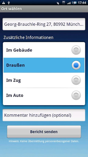 NEU: Sie können im Freien mit Hilfe von GPS einen Bericht "Kein Netz" erstellen und speichern. Beim nächsten Start der App mit Netzverbindung wird der Bericht versendet.