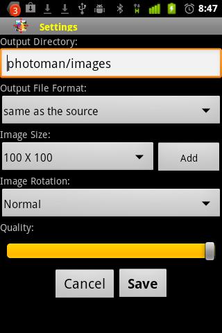 This app is used to resize your photo images to different sizes and send them to others using email, SMS messaging etc. Multiple images can be resize and sent at once.