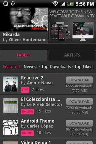 Alle Reactable mobile Anwender erhalten Zugang zu exklusiven Inhalten. Download-und Remix von originalen Tracks von Oliver Huntemann, Nortec Collective: Bostich + Fussible, Amo + Navas, Gui Boratto und viele mehr.