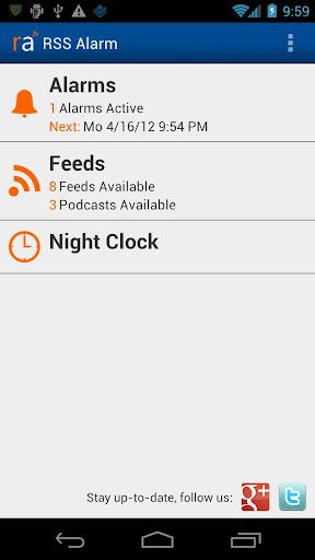 RSS Alarm is an alarm clock with an emphasis on staying up-to-date. Wake up in the morning to the latest news via RSS feeds, read out by your phone. Rise to that podcast you've been meaning to listen to. You can even use a normal alarm tone if that's your style.