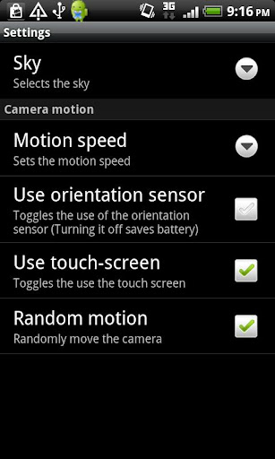 - Motion can be controlled using the orientation sensor, the touch screen, or randomly. The motion speed can be defined in the application settings.