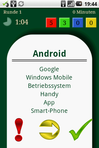 Tabu!Droid beinhaltet neben dem klassischen Team-Modus auch noch einen "Jeder gegen jeden"-Modus, so dass nun endlich auch zu dritt gespielt werden kann.