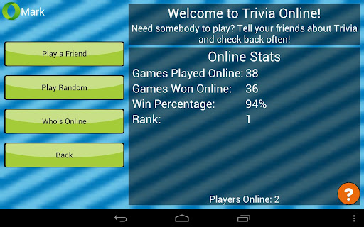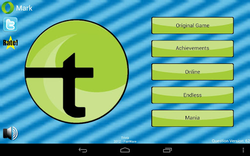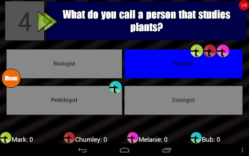 Are you ready for the best trivia experience on Android? Get quizzed in the game-show style trivia game with computer players Chumley, Melanie, and Bub, or take on real players in Online Mode. Play by yourself in Endless Mode, then upload your high score to the global leader board. Test your knowledge in the categories of General Knowledge, History, Math, Geography, Music, Sports, TV/Movies, Computers/Technology, and Video Games.