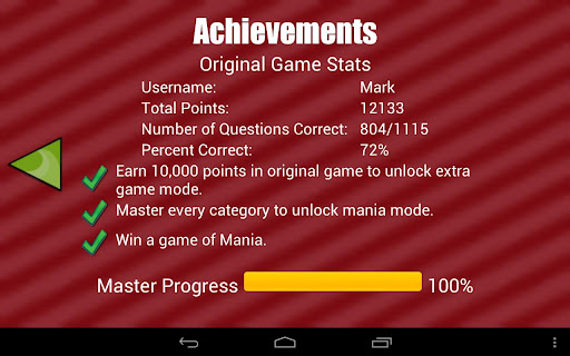 *Cloud saving. With a FairWare ID, retrieve your stats and progress from any Android device running Trivia. Never worry about losing your progress