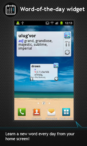 • Test yourself with a Word of the day widget on your Home screen. A random entry from the dictionary is changed daily (Menu->Settings->Install widget)