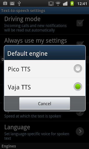 2. Activate Vaja TTS Engine at the bottom of the screen, then select Vaja TTS as a Default Engine.