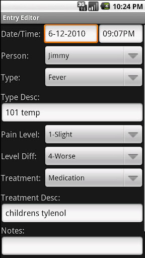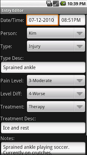 A simple and convenient way to track injuries, health status, and daily healing progress for you or your loved ones. Keep a journal of treatment and pain level. Attach picture with camera phone. Email health updates to your doctor or other concerned party. Track multiple people and customize entry types and treatments.