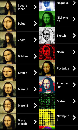 - Pinch, Square Pinch, Bulge, Zoom, Bubbles, Stretch, Mirror, Glass Mosaic, Tunnel (Pro), Whirl (Pro), Square (Pro), Water (Pro)