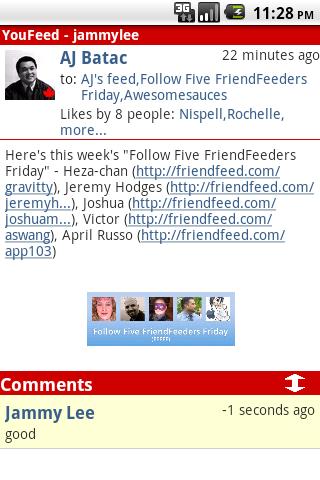 YouFeed is a very clean FriendFeed client. Note: Froyo works for most, if it don't, try to install it in internal storage instead of SD Card. To know more, goto here: http://jammylee1983.appspot.com/android/youfeed.html